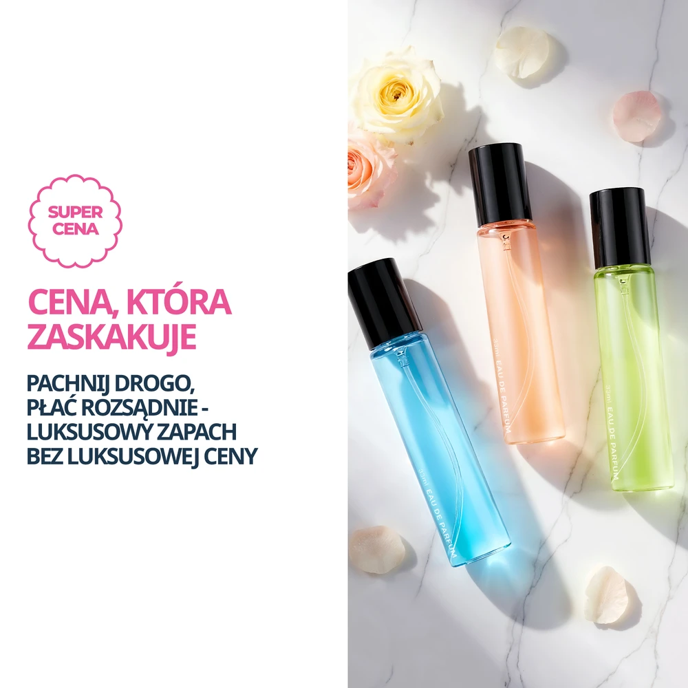 Bazujemy na najwyższej jakości francuskich kompozycjach zapachowych, których akordy i proporcje są projektowane tak, by jak najwierniej oddać charakter znanych zapachów. Precyzyjnie odwzorowujemy nuty głowy, serca i bazy, dzięki czemu klientki rozpoznają znajome brzmienie od pierwszego psiknięcia aż po długi, zmysłowy finisz. Efekt? Otrzymujesz perfumy o jakości, projekcji i rozwoju na skórze bardzo zbliżonych do pierwowzorów - w cenie, która zachęca do testów i rotacji zapachów na co dzień.